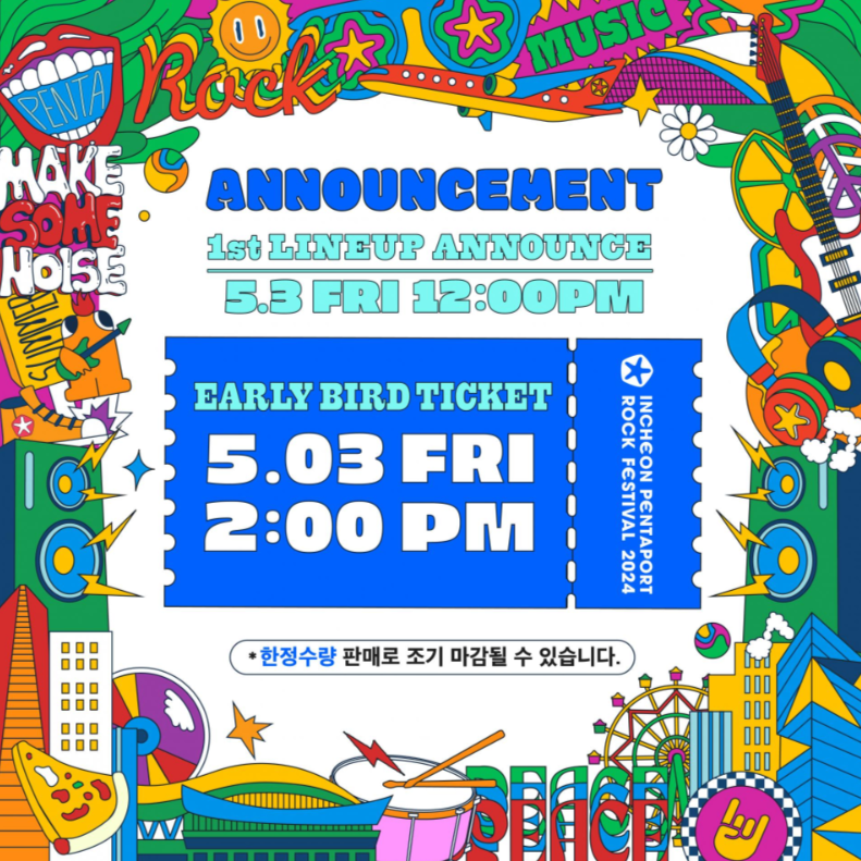 2024 인천펜타포트 락 페스티벌이 드디어 2024년 08월 02일(금) ~ 4일(일) '송도달빛축제공원'에서 열립니다. 티켓팅은 인터파크 티켓에서 2024년 5월 03일(금) 오후 2시로 확정되었습니다. 너무 인기가 많은 페스티벌이니 이번 얼리버드티켓이 오픈되었을때 빠르게 예매하셔서 한여름밤의 추억을 만들어 보세요