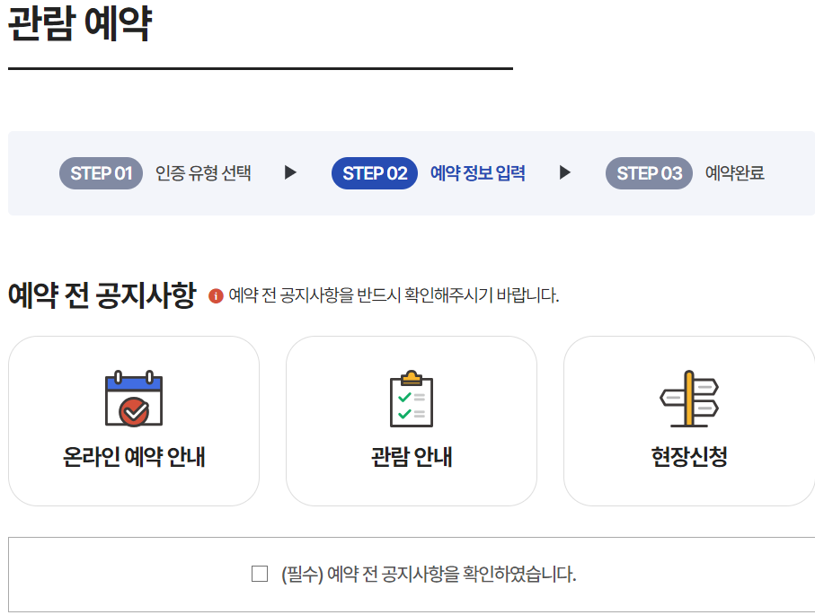 - 당일 입장 전에는 보안 검사를 거쳐야 하므로 여유로운 시간을 갖고 방문해야 합니다.