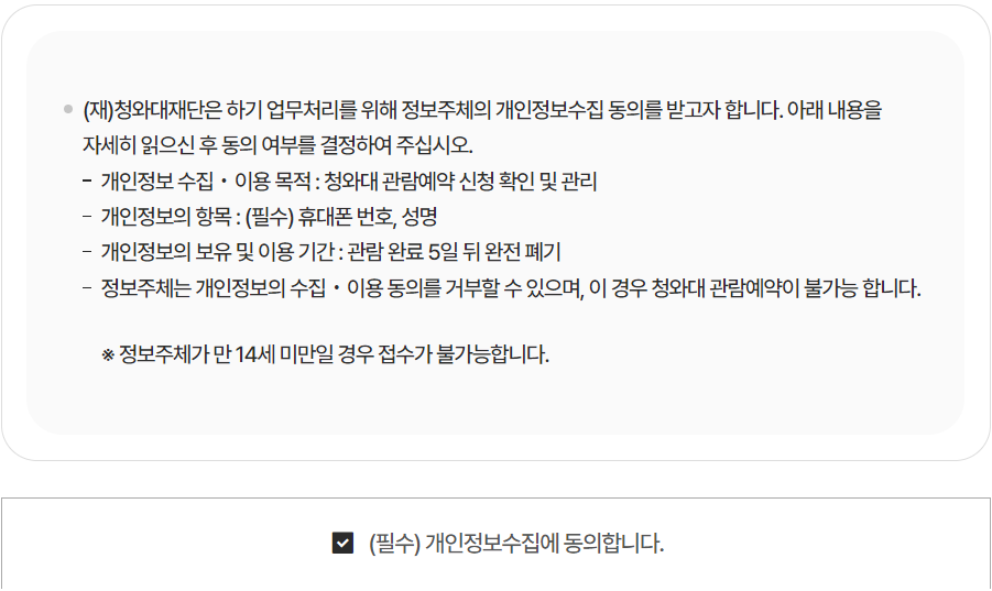 - 단체 관람의 경우에는 대표자가 모든 인원의 신분증 정보를 일괄하여 입력해야 하며 방문 인원 각자의 동의를 받은 후 이를 행해야 함
