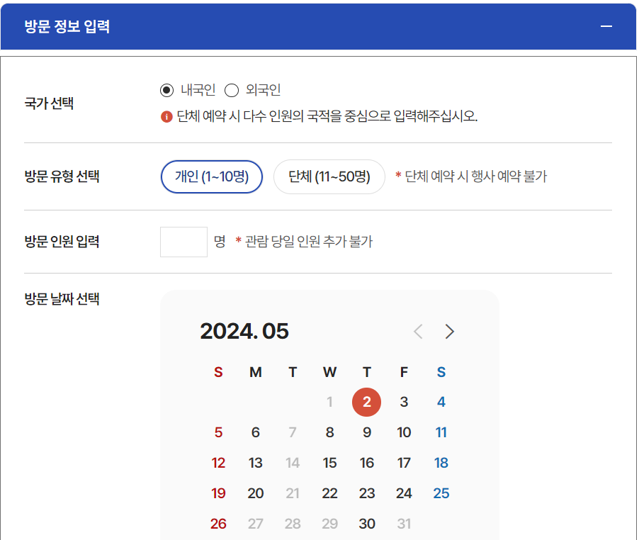- 관람가능 인원 : 개인 1~10명, 단체 11~50명(단체 행사 불가), 다자녀가족(인원제한 없음)