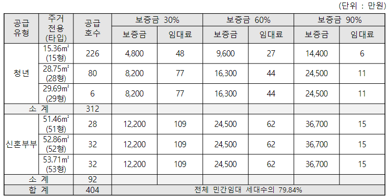 청년(312세대), 신혼부부(92세대) 임대보증금 및 월 임대료